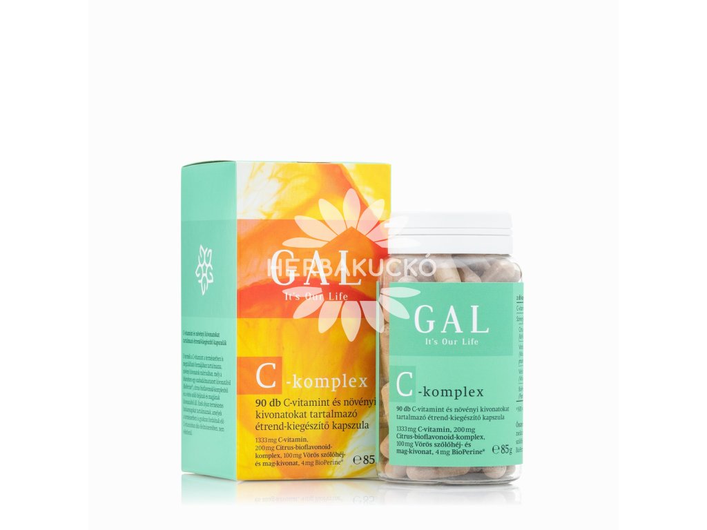 GAL C-komplex, 1333mg C-vitamin, 100mg szőlőmag- és héjkivonat + 200mg bioflavonoid x 45 adag. Nagy dózisú C-vitamint, annak felszívódását és újrahasznosulását segítő növényi kivonatokat tartalmaz bioflavonoidokkal együtt. A benne lévő vörös szőlőhéj- és mag-kivonatok szintén segítik a szervezet védekezőképességét, erős antioxidánsok, és a szívre, erekre, látásra kifejtett hatásuk miatt is előnyösek.