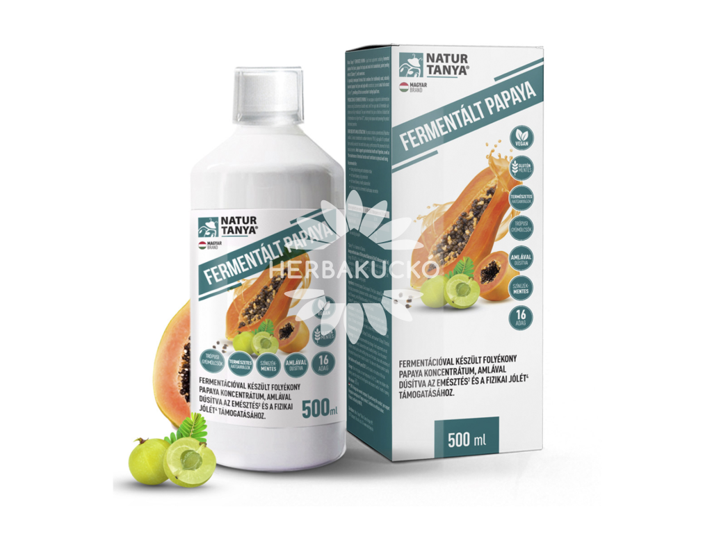Natur Tanya Fermentovaná papája s amlou je tekutý výživový doplnok vyrobený fermentáciou papáje pomocou kultúry Saccharomyces boulardii, doplnený o štandardizovaný extrakt z amly (Phyllanthus emblica).
